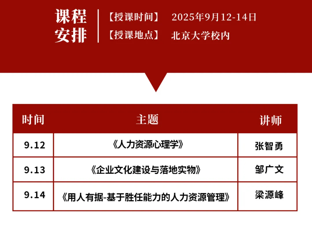 🌟北大出品,必属精品!北京大学人力资源CHO研修班现面向大家招生啦,3天课程安排,《人力资源心理学》《企业文化建设与落地实务》《用人有据-基于胜任能力的人力资源管理》等干货满满,毕业可获得北京大学结业证书,证书官网可查。