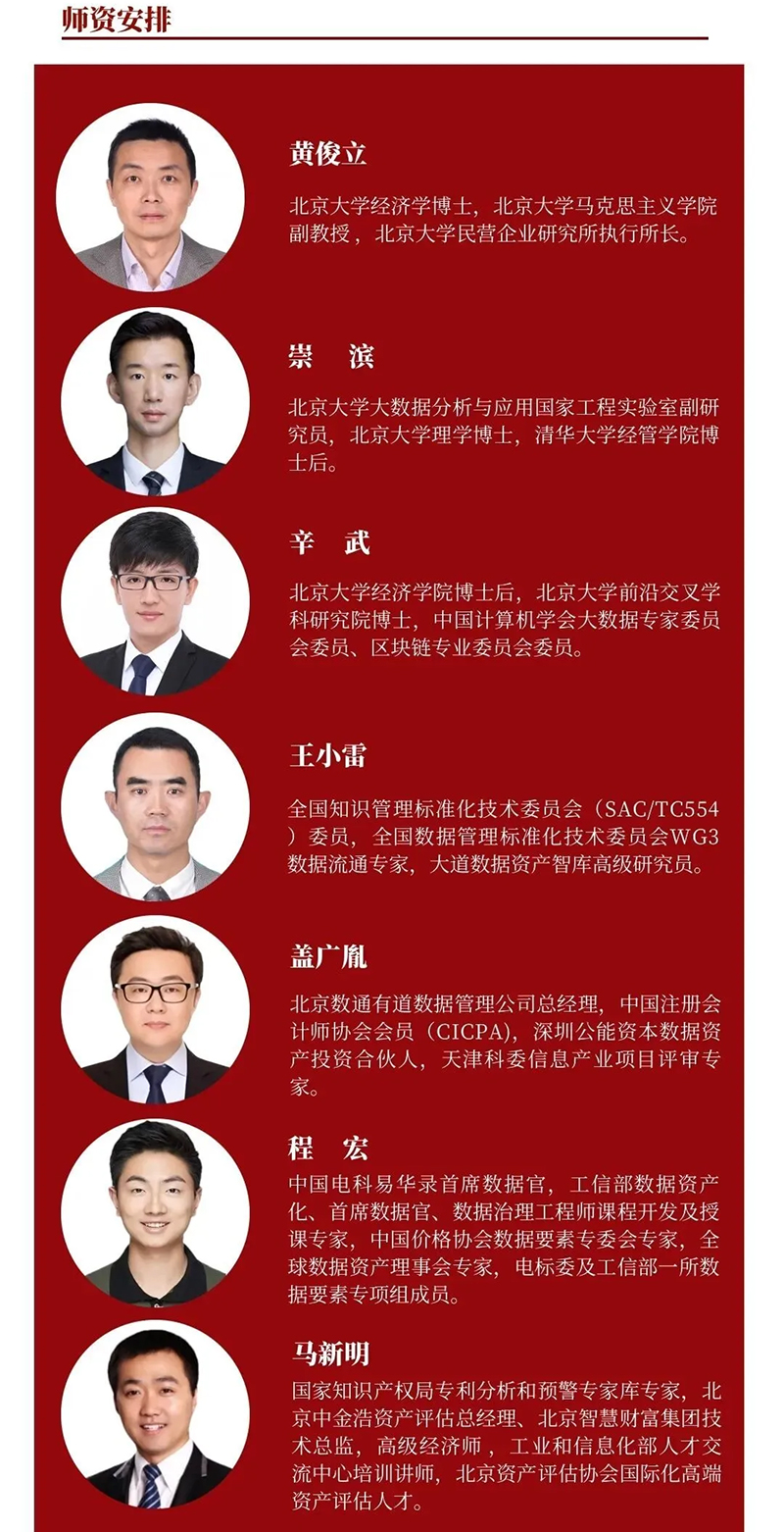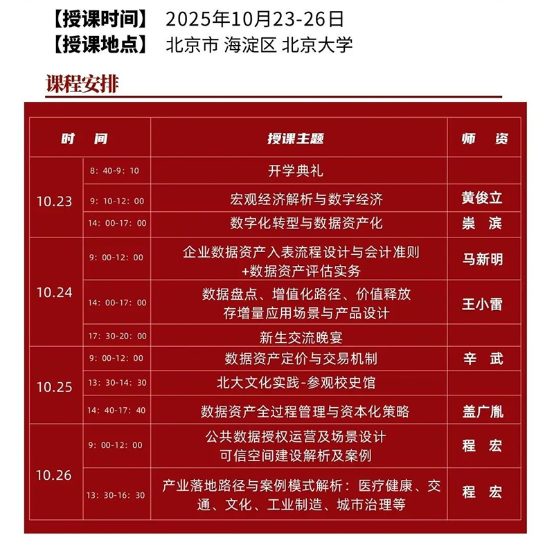 数据已成为核心生产要素,数据资产管理与资本化是企业数字化转型的关键命题。北京大学数据资产管理与数据资本化策略研修班,于 2025 年 10 月 23-26 日在北京大学开展,汇聚黄俊立、崇滨、辛武等多位数据领域权威专家,围绕宏观经济与数字经济、数据资产入表、定价交易、全过程管理及产业落地等全链路内容授课,助力企业在数据资产领域构建核心竞争力。