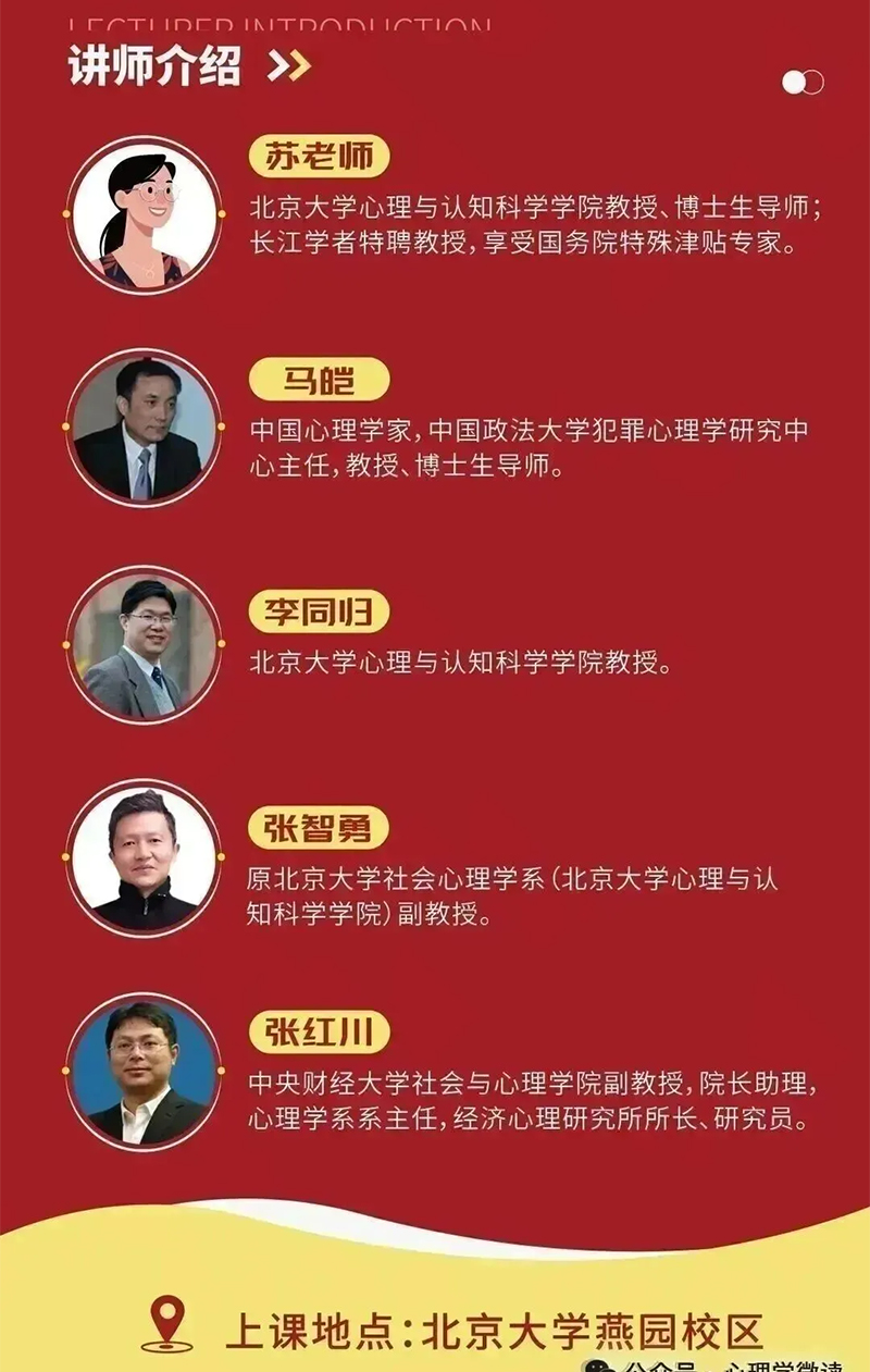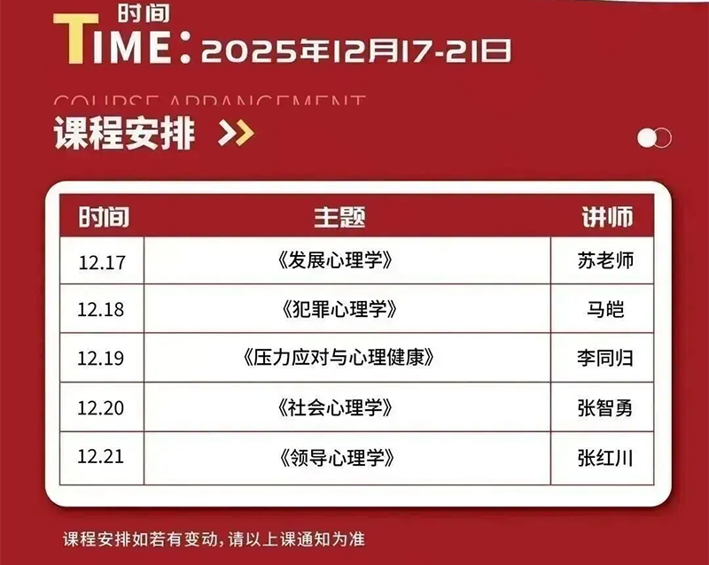 北京大学心理学研修班8期12月17-21日课程表 北京大学心理学研修班(第八期) 9,800元 2025年12月17日 5天,学制40学时。 13439064501 陈老师 报名 2025-09-24 北大课表 154 0 心理学,一门深入人心的学科。北大心理学研修班邀您一同探索心灵的广袤世界,解锁自我认知的新篇章。专业师资,深度解读,让我们在知识的海洋中,找到理解自己与他人的钥匙。期待热爱心理学的你,与我们共同踏上这段心灵成长之旅!北京大学心理学研修班(八期)12月17-21日开课 授课老师 张智勇 课程动态 【课程回顾】北京大学心理学研修班第六期 7月9日,北京大学心理学六期研修班在庄重的开学典礼中拉开了序幕!01 犯罪心理学Criminal psychology马皑教授中国心理学家,中国政法大学犯罪心理学研究中心主任,教授、博士生导师,中国政法大学博士,中国政法大学社会学院教授,国内法律心理学、犯罪与刑事司法心理学学科、学术带头人之一,中国政法大学社会学院副院长。马教授首先介绍了司法心理学的学科属性、学科位置以及学 北京大学心理学研修班 7月10日,北京大学心理学研修班如期开班!心理学是一门探究人类行为和心理活动规律的科学,它与我们的日常生活、工作息息相关。无论是理解自己、改善人际关系,还是提升工作效率、促进心理健康,心理学都能提供宝贵的理论指导和实践方法。第一课《心理咨询与操作技能》赵然中央财经大学心理系教授、研究生导师中央财经大学企业与社会心理应用研究所所长国际员工帮助计划协会(EAPA)中国分会主席美国 University 本文分类:北大课表 本文标签:北京大学心理学研修班北大心理学研修班马凯李同归张智勇张红川 浏览次数:154 次浏览 发布日期:2025-09-24 17:35:11 本文链接:https://gototsinghua.org.cn/beidakebiao/44247 上一篇 > 北京大学管理学与领导力研修班10月22-26日开课通知 下一篇 > 北京大学金融与投资研修班10月18-19日课程安排 相关推荐 北京大学战略决策与管理心理学研修班10月18-19日课程安排 北京大学心理学研修班8期12月17-21日课程表 北京大学管理学与领导力研修班10月22-26日开课通知 北京大学心理咨询研修班11月12-16日第一期开学
