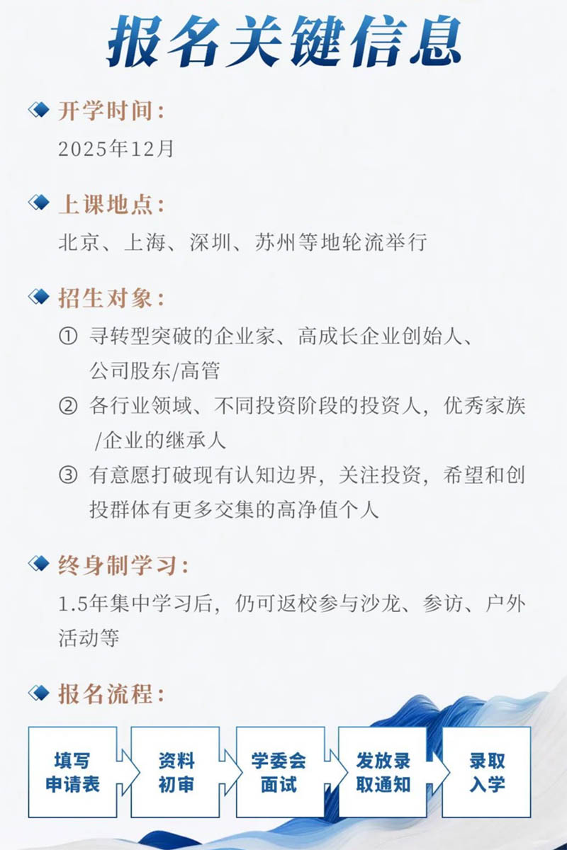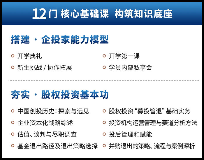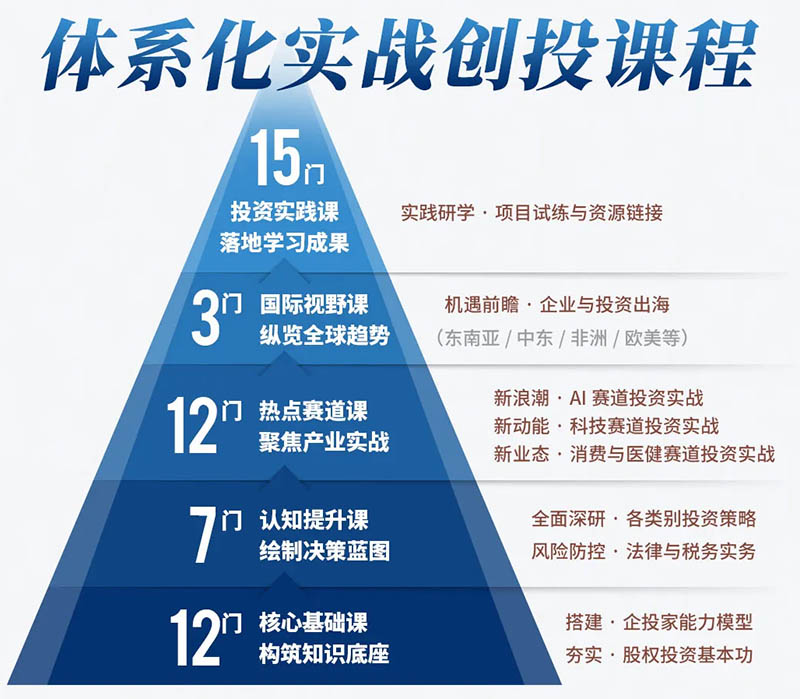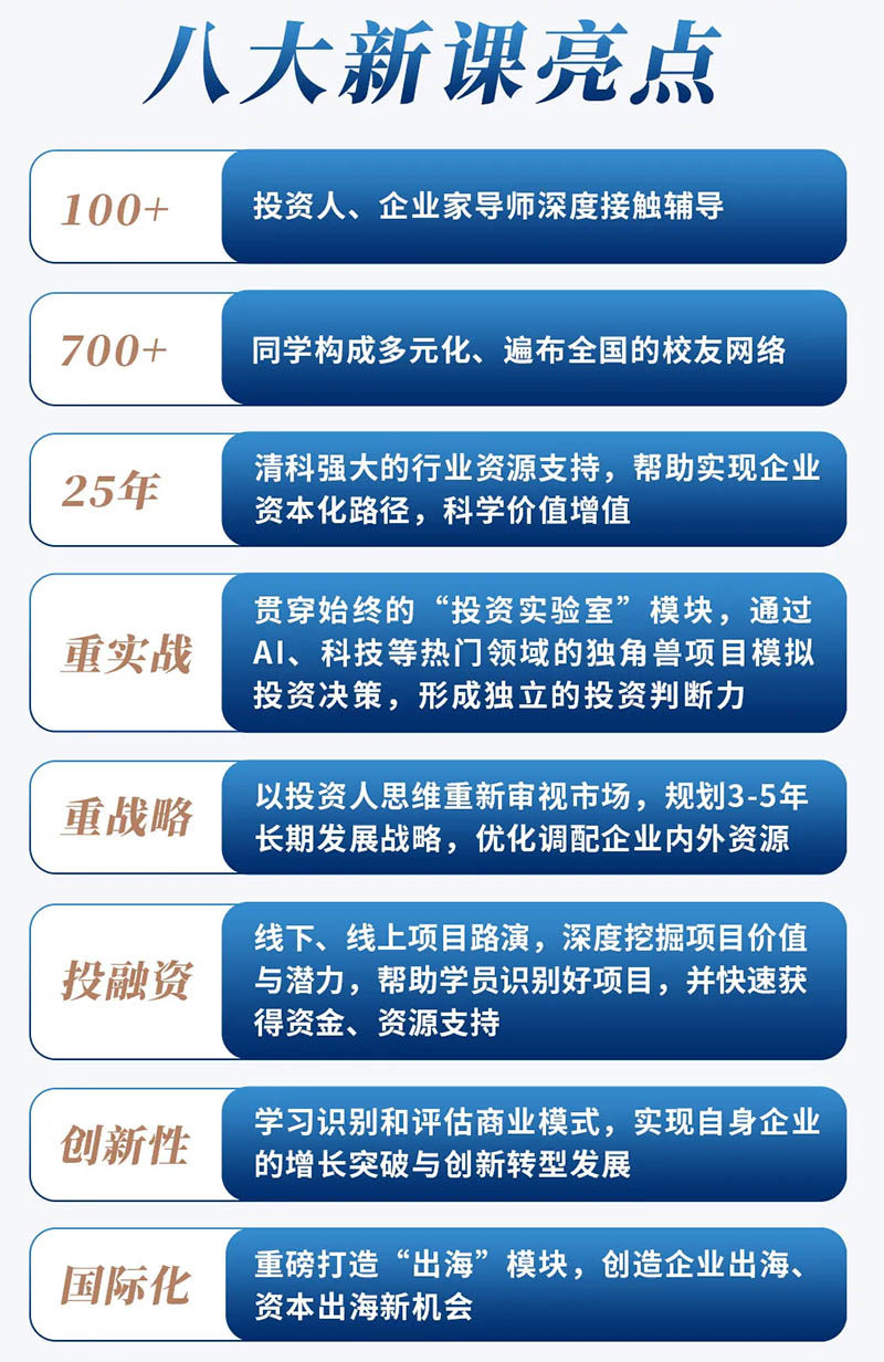 本课程深度整合清科创业(1945.HK)二十余年沉淀的行业资源,搭建与百余位资深投资人、企业家导师深度交流平台,打造“产业趋势研判-资本视角构建-理论模型搭建-实战淬炼提升-资源精准链接”五维一体学习体系,并依托由数百名跨地域、跨行业精英企投家组成的多元化校友网络,共同探索资本化新路径与企业发展新突破。
