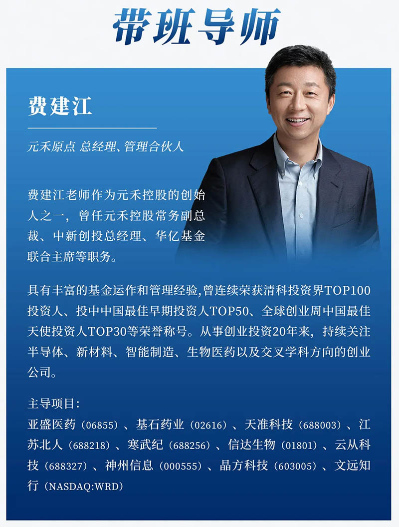 沙丘尽管拥有顶级投资人师资团队,仍为每班配备了专属带班导师。16期将由元禾原点总经理费建江担任,深度参与课研及实践,贡献资源,促进合作。
