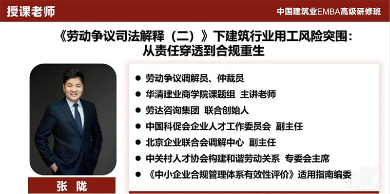 《新劳动争议司法解释(二)》的正式出台,对建筑行业来说有着不小的影响,从责任穿透、人力成本暴增、风险失控到传统模式崩溃等危机重重。为帮助企业调整用工结构,提前应对风险,19日,由劳动争议领域资深仲裁员张陇老师为同学们带来《〈劳动争议司法解释(二)〉下建筑行业用工风险突围:从责任穿透到合规重生》主题分享。