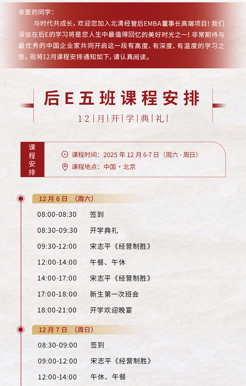 北清后EMBA董事长研修班12月6-7日|宋志平会长讲经营哲学 与时代共成长-北清经管后EMBA董事长高端项目 100,000元 2025年12月06日 学制18个月,共计12+1次课程,每次两天+1天社群学习 13439064501 陈老师 报名 2025-09-28 课程安排 186 0 #北清经管后EMBA董事长高端项目 中国上市公司协会会长、中国企业改革与发展研究会会长 #宋志平 作为一把手,创业路上如何打下江山?又该如何守好江山?12月6-7日宋志平教授将为后E5期带来开学典礼大课,欢迎加入! 授课老师 宋志平 课程动态 北清经管后EMBA | 行知中国·走进京东 为近距离学习行业领军者的成功经验,北清经管后EMBA董事长高端项目组织企业家同学走进京东集团,开启了一场以“AI 数字化布局与实践”为核心的深度探访之旅。踏入可视化数字展厅,动态流转的数据大屏吸引了所有人的目光——从全国仓储物流实时调度信息,到消费需求预测曲线,再到智能供应链的效率优化数据,每一组数字都直观呈现着京东数字化体系的强大算力。顺着展厅动线前行,京东云专属展区带来了另一重惊喜。展区以“云 北清后EMBA马成功授课:AI时代人才与组织升级新范式 金秋九月,北清经管后EMBA黄埔三期、四期的企业家学员们再度相聚北京,在专注的学习氛围中踏上一场关于组织进化与人才升级的深度研修。当AI技术重塑企业运转逻辑,当传统管理模式难以适配新时代需求,北清经管管理实践教授、京东大学首任执行校长马成功老师,以数十年组织管理实践为基,用系统的方法论与鲜活的案例为引,带领同学们拆解“自管理”如何激活个体创造力、“三轮驱动”如何筑牢组织韧性,在变革中找寻企业可持续 北清经管后EMBA·行知中国 | 贵州——黔商论道,贵境寻踪 为期四天的贵阳访学之旅已圆满落幕,回望此行,同窗间商业智慧的交锋、对区域经济生态的深度解码、对产业蓝海的精准锚定,构成了这段旅程最厚重的注脚。这场以 “黔商论道・贵境寻踪” 为主题的行程,既是一次商业认知的迭代升级,更是一场同窗情谊的深度淬炼。傍晚的贵阳阳光依旧火辣,立秋当天,当大家陆续抵达这座西南枢纽城市,首站的甲秀楼之行便暗藏深意。这座始建于明万历年间的楼阁,四百余载风雨中始终是贵阳城的精神地 为什么好企业都在学宋志平?《经营方略》40年经营智慧再升级! 2025年6月,汇集了宋志平深耕企业40年实践探索思想精粹的经典之作《经营方略》第四个升级版本正式发布。本书里面几乎囊括了宋志平经营企业过程中所凝练的全部重要思想,从战略与目标、创新与发展、治理与管控、团队与组织、文化与愿景五个方面,系统呈现了这位大型企业领军人物独具特色的经营之道。书中真实记录了国有企业改革的艰难历程,深入解析了整合优化、央企市营、格子化管控等企业创新思想,以及资本运营、联合重组 溯古启今,笃行逐光 | 北清经管后EMBA黄埔三期五月开课纪实 在历史的长河中,西安宛如一颗璀璨的明珠,承载着千年的辉煌与文化底蕴。在这个明媚的五月,后E三班的学员们怀揣着对知识的热切渴望,踏入了这座古老而充满活力的城市,开启了一场别开生面的学习之旅。在这里,同学们不仅领略了古城的风华绝代,更在思想的碰撞与智慧的启迪中,收获了满满的行业洞察与人生感悟。西安分院参访:感知蓬勃生命力踏入西安分院,同学们深度洞悉其当下运营现状与未来规划布局。真切感知分院蕴藏的蓬勃生 北清经管十一月第三周开课纪实 长期采用低价策略并维持较低利润率不仅会削弱投资者的信心、影响员工士气,还可能减少对技术创新的投资,进而影响到产品和服务的质量。“价 学员感言 北清经管后EMBA开学大课笔记-自适迭代 本文分类:课程安排 本文标签:北清后EMBA后EMBA董事长经营哲学宋志平 浏览次数:186 次浏览 发布日期:2025-09-28 18:41:32 本文链接:https://gototsinghua.org.cn/kebiao/44255 上一篇 > 北清资本运营与股权投资项目0月17-19日清华科技园开课 下一篇 > 清大厚德女性班10月25-26日课程表 相关推荐 北清后EMBA董事长研修班12月6-7日|宋志平会长讲经营哲学 北清后EMBA9.20-21课程安排 北清经管后EMBA开学大课笔记-自适迭代 北清经管后EMBA7月12-13日课程安排