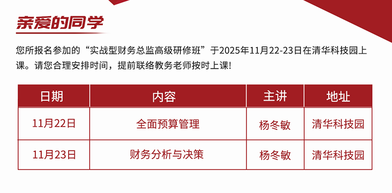 11月22日《全面预算管理》杨冬敏11月23日 《财务分析与决策》杨冬敏