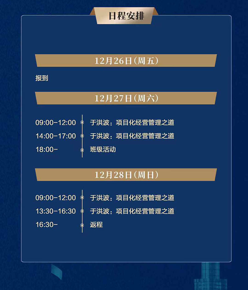 全国医药、医疗器械董事长精品班12月27-28日海口开课 全国医药、医疗器械董事长精品班 98,000元 2025年12月27日 学制一年,每月集中学习2-3天。学费8.8万 13439064501 陈老师 报名 2025-11-27 课程安排 68 0 12月27-28日 《项目化经营管理之道》于洪波工商管理 博士项目管理 实战派专家北大、清华等高校《项目管理》特邀主讲教授 授课老师 于洪波 课程动态 创新驱动发展 | 全国医药、医疗器械董事长班参访苑东生物 2025年6月27日,商帅商学院全国医药、医疗器械董事长班17期走进科创板上市企业——成都苑东生物制药股份有限公司(股票代码:688513),深入考察这家以创新驱动的高新技术企业。通过实地参观与座谈交流,学员们领略了苑东生物在麻醉镇痛等领域的研发实力与国际化布局。企业参访参访伊始,商帅商学院医董项目主任李文向苑东生物赠送制定纪念礼品,苑东生物营销中心总经理周荣代表企业接受赠礼,对同学们的到访表示诚 春潮聚势 起新程|全国医药行业董事长班18期开学典礼 春潮涌动,万象更新。2025年4月19-20日,全国医药行业董事长精品班18期开学典礼在北京圆满举行。在“健康中国”中国战略纵深推进之际,这场开学不仅是行业菁英聚势启航,更昭示着医药人共赴未来的担当与锋芒。开学典礼春潮涌动脉搏,菁英共启新章。开学典礼由全国医药行业董事长精品班18期班主任葛莹玲主持。政策解码定锚,智语擘画蓝图。国家医疗保障局基金监管司原副司长段正明、商帅商学院院长宋明出席典礼并致辞 从两会政策到云药实践|医药、医疗器械董事长16期云南移动课堂 2025年3月28-31日,全国医药、医疗器械行业董事长班16期移动课堂走进云南昆明,政策领航,行业深耕,拓展视野,提升认知。3月28日,医董16期同学走进云南福润达医药,近距离学习一家深耕云南23年的医药物流标杆如何以"至诚之心"构建医疗供应链,诠释医药流通企业的责任与创新。在云南善慷药业,同学们见证这支年轻化的专业团队如何以"尚德尚康"理念深耕药品推广18年。从临床到OTC的精准营销,到学习型 企业参访〡全国医药、医疗器械董事长班13期走进和泽医药 杭州游学2023 3 17—19日近年来,杭州已逐渐发展成为国内生物医药产业领域的创新高地之一,产业链、创新链、资金链和政策链等深度融合。通 以学会友 乐在其中 | 全国医药、医疗器械行业工商企业管理EMBA高级研修班华南班课程圆 四月芳菲未尽,五月花香四溢。令人感慨万千的是繁花似锦,5月18-19日,企业战略、运营专家,北京大学、清华大学总裁班授课老师孟志强讲解《运营突破》-以结果为导向的“自运营”系统课程,孟老师作为咨询管理顾问公司的创始人,基于大量的企业运营实战案例 董事长很忙 | 商帅医董班三亚游学之旅 实战型股权问题专家,北京大学医药总裁班授课老师刘国镔为同学们讲授《股权激励与公司治理》。刘国镔老师授课方式非常新颖,将授课内容编成歌曲并带大家一起唱,而且通过许多股权激励的实际案例,深入浅出地讲解了股权激励的方法 本文分类:课程安排 本文标签:医药总裁班于洪波 浏览次数:68 次浏览 发布日期:2025-11-27 23:17:58 本文链接:https://gototsinghua.org.cn/kebiao/44442 上一篇 > 全国医药行业工商管理研修班12月13-14日开学典礼 相关推荐 全国医药、医疗器械董事长精品班12月27-28日海口开课 北大AI时代商业领航者研修班12月6-7日课程安排 医药EMBA总裁班6月27-29日北京开课:张志伟 5月24-25日医药行业EMBA研修班北京开学典礼