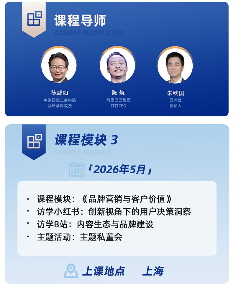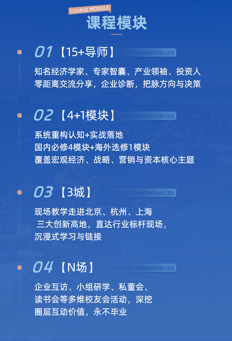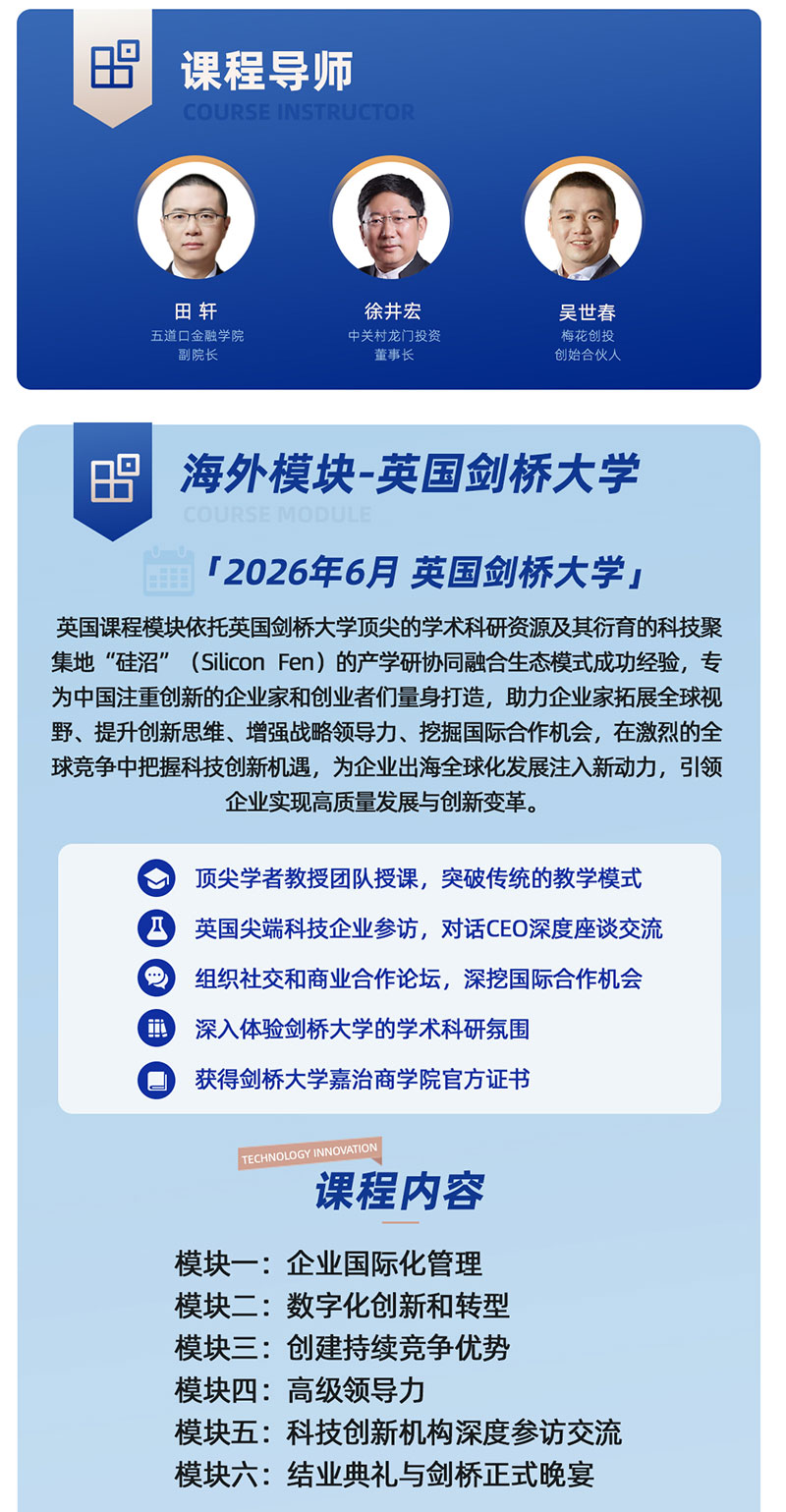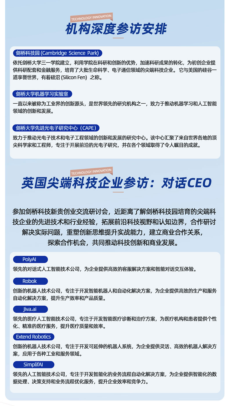 1️⃣课程安排:国内4模块,每2个月集中学习一次,每次2-3天(含标杆企业参访、知名导师授课、主题私董会),海外模块(英国7天游学,剑桥科技园、剑桥大学机器学习实验室、DEEPMIND、CAPE深度参访,对话PolyAI、Robok等企业CEO、对接当地政商资源)