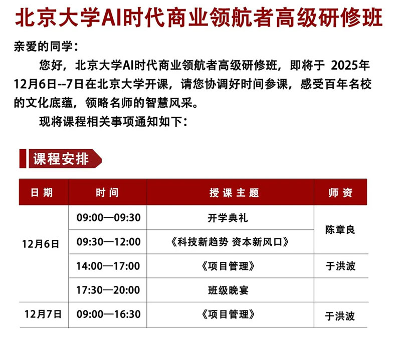 北大AI时代商业领航者研修班12月6-7日课程安排 北京大学AI时代商业领航者高级研修班 68,000元 2025年10月25日 学制一年,共160课时 13439064501 陈老师 报名 2025-11-10 北大课表 7 0 【北大AI时代商业领航者研修班】AI时代企业高管必修课!结合人工智能时代发展趋势,塑造具有远见着实和创新精神的新一代商业领袖。学制:一年,每月2天,共160学时学费:68000元/人地点:北京大学 (颁发北大证书)报名:13439064501 陈老师报名申请,请联系负责老师! 开课日期:2025年 12月6-7 校内开课 授课老师 陈章良 于洪波 课程动态 北京大学AI领航者研修班“数字时代品牌战略与价值特征”课程回顾 在北大的课堂与交流场域,一场知识与思想交融的学习之旅落下帷幕。签到伊始,同学们带着期待而来,在签到桌前认真留下身影,开启这段求知之行。课堂诵读环节,大家整齐站立,齐声诵读,以专注的姿态开启知识汲取的序幕,在朗朗书声中感受学习的仪式感。课程讲授时,薛旭教授围绕 “数智时代品牌战略与价值特征品牌战略工具体系” 深入讲解。从理论阐释到案例剖析,抽丝剥茧般为同学们梳理品 北京大学AI时代商业领航者高级研修班5月课程回顾 万物竞发,智启新程。2025年5月24日至25日,备受瞩目的北京大学AI时代商业领航者高级研修班在北京大学隆重举行了开学典礼并成功开启了首次课程学习。来自全国各地的优秀学员齐聚燕园,共同开启了一段探索人工智能时代商业变革与领导力的智慧之旅。5月24日上午,伴随着庄重而充满期待的开学典礼,本期研修班正式拉开帷幕。学员们带着对知识的渴求和对未来的憧憬,正式成为北大的一员,共同肩负起在AI浪潮中引领商业 本文分类:北大课表 本文标签:陈章良于洪波北京大学研修班北大总裁班 浏览次数:7 次浏览 发布日期:2025-11-10 15:23:19 本文链接:https://www.gototsinghua.org.cn/beidakebiao/44389 上一篇 > 北京大学医院管理领军人才| 12月6-7日开课 相关推荐 北大AI时代商业领航者研修班12月6-7日课程安排 北大企业数字化工商管理研修班12月13日开学 北京大学中国美学高级研修班11月29-30日晋唐风骨 北京大学历史研修班11月29-30日课程安排